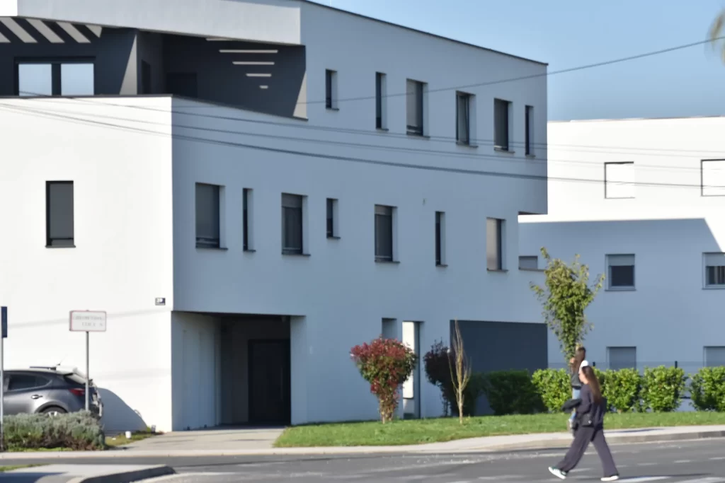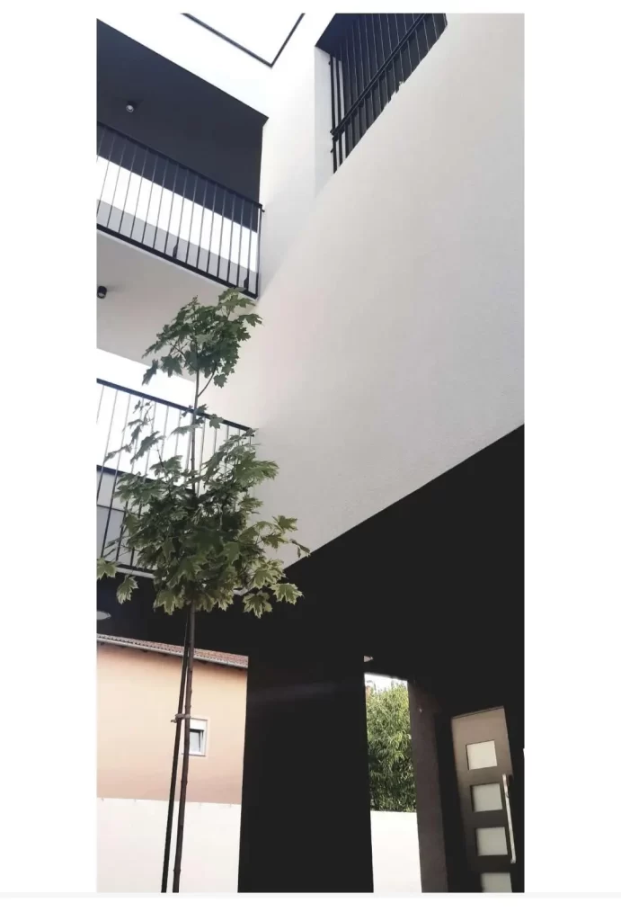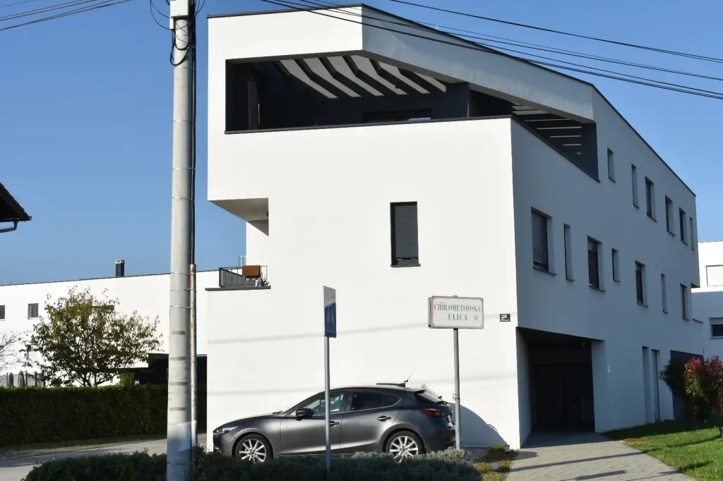 Na katovima se volumen otvara prema atrijima i ulici. Uvučene lođe i velike natkrivene terase pružaju privatne vanjske prostore, dok pergole i izrezani otvori unose igru svjetla i sjene, stvarajući dinamičan i suvremen izraz pročelja. Bijela fasada u kontrastu s crnim detaljima prozora, sjenila i konstrukcijskih elemenata daje objektu prepoznatljiv i minimalistički karakter.