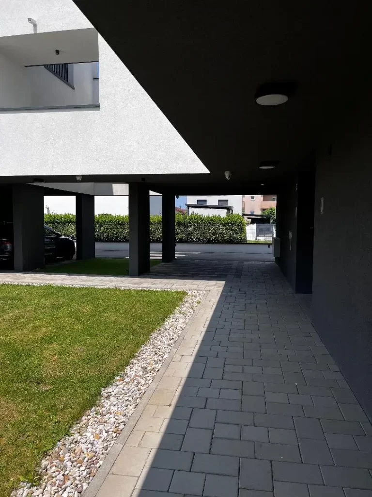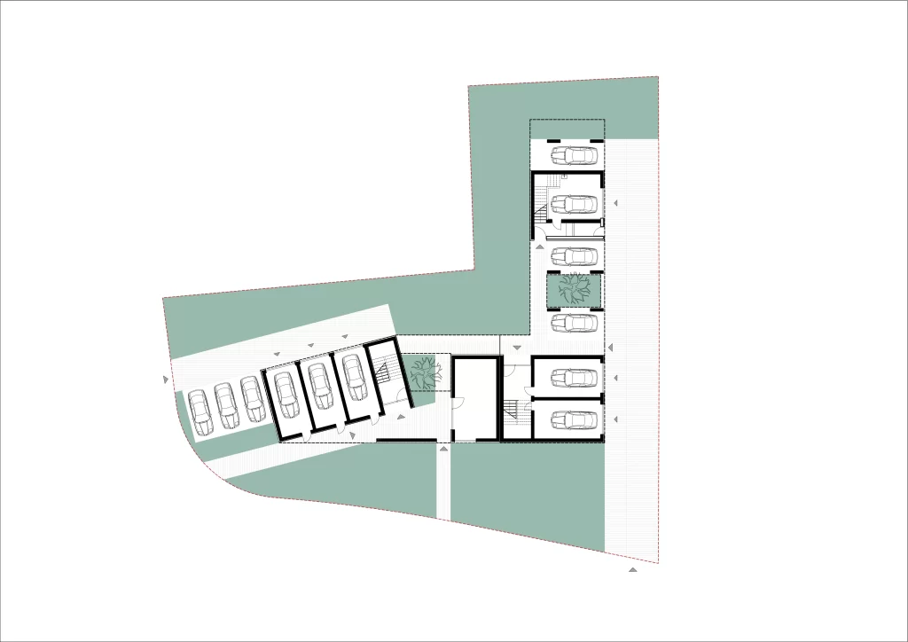 Prizemlje je projektirano kao polu javni prostor s natkrivenim trijemovima koji omogućuju pristup garažama, parkiranje i zajedničke funkcije, a istovremeno povezuju unutarnje dvorište sa susjedstvom. Tamni stropovi u kontrastu s bijelim zidovima naglašavaju prostornu jasnoću i dojam dubine prolaza.