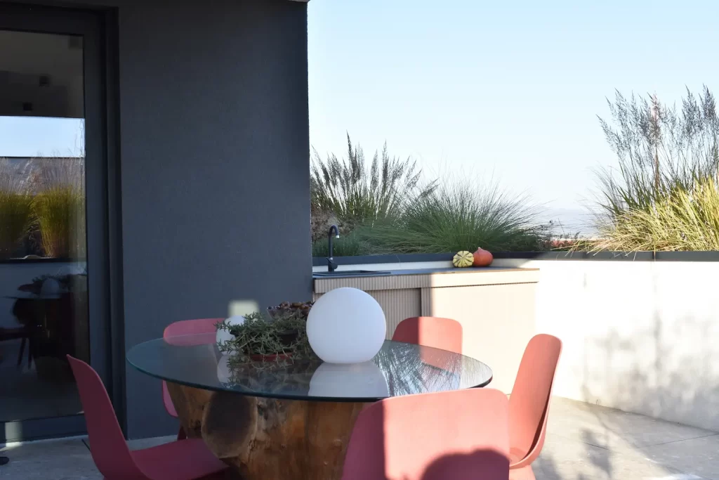 Prostrani dvoetažni stan s tri spavaće sobe i dvije kupaonice, osmišljen za vrhunski komfor i moderan način stanovanja. Stan okružuju žardinjere duž cijelog prostora, koje stvaraju osjećaj privatnosti i povezanosti s vanjskim okruženjem, uz panoramski pogled na Samobor.